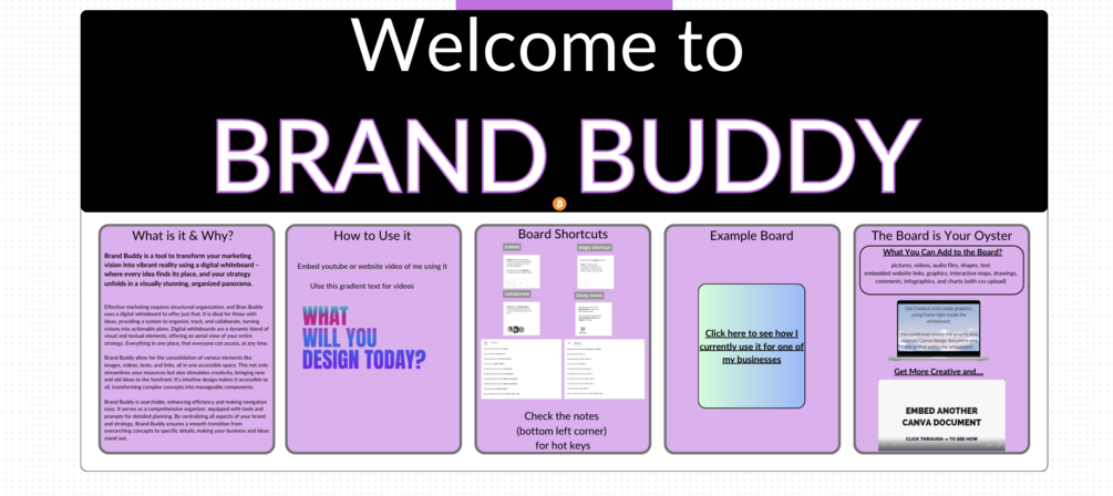 You will receive a PDF with a link to the Canva whiteboard Brand Buddy template. From within the Brand Buddy you will have access to examples as well as being able to see how I am currently using it for another one of my businesses.